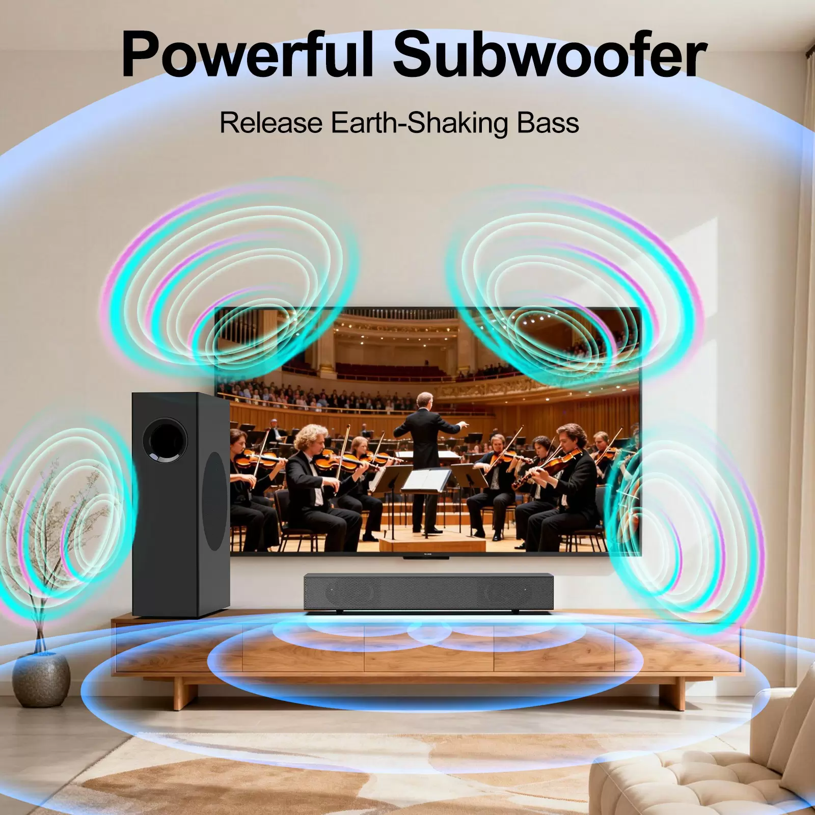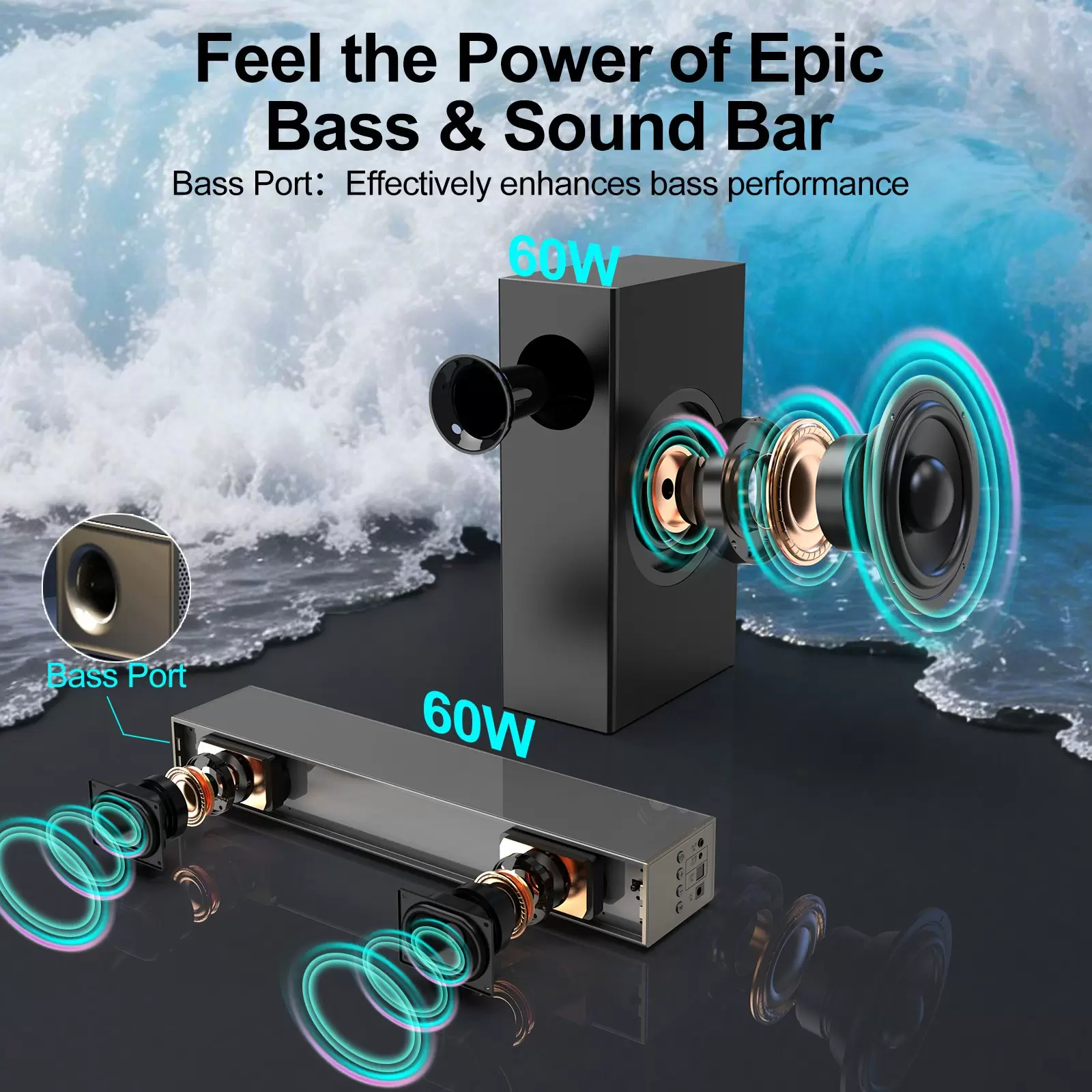 Powerful Bass with Wired Subwoofer: Pair this TV soundbar with 60W subwoofer to experience deep, resonant bass response down to 50Hz. The combination of soundbar and subwoofer delivers a total of 120W of surround sound, immersing you in every scene. From action blockbusters to musical parties, this soundbar brings exceptional sound to your living room.