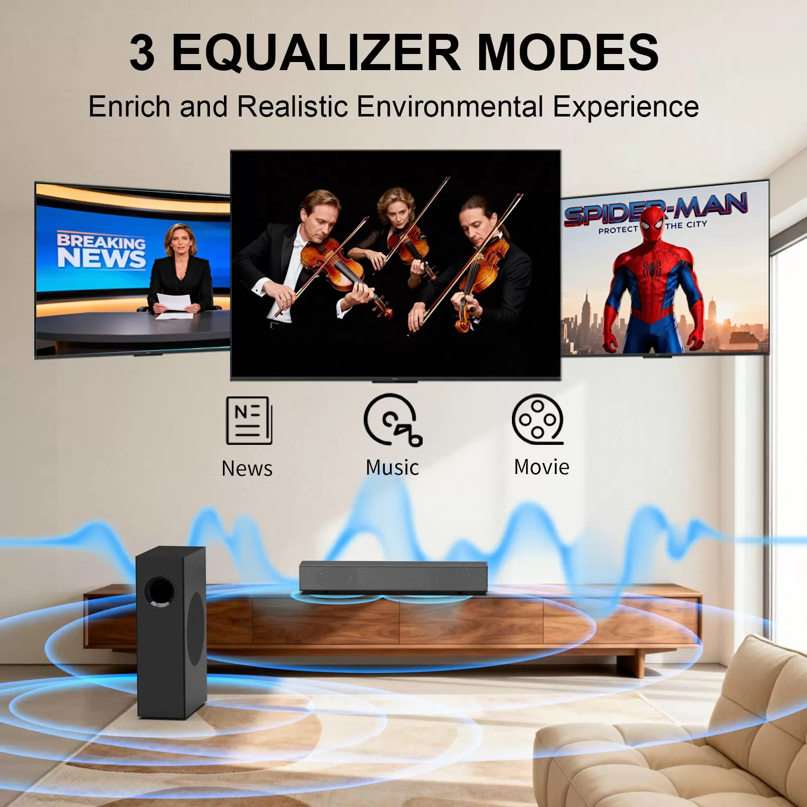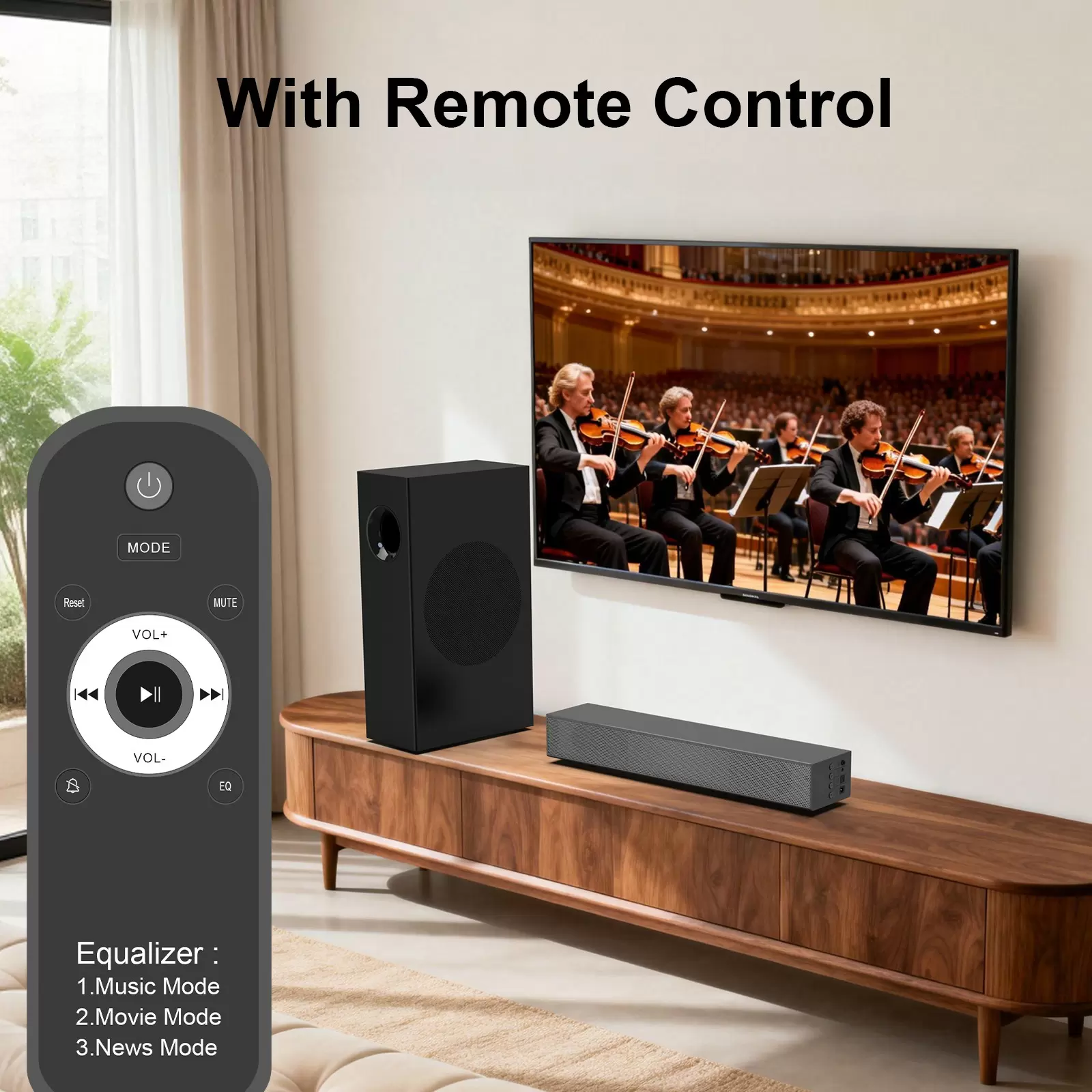 Three Sound Modes: This smart TV soundbar offers three adjustable sound modes: Music, Movie, and News. Using the included remote, you can tailor the soundbar’s bass and treble to your personal preference. It ensures clear dialogue, powerful bass, and crisp highs for a balanced listening experience.