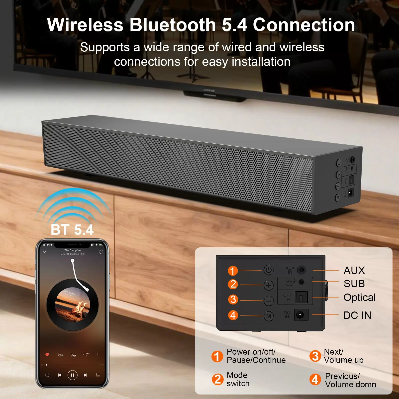 Versatile Connectivity: The soundbar offers multiple connection options, including Bluetooth 5.4, SUB, Optical, and AUX inputs, ensuring seamless compatibility with your TV, phone, or any other Bluetooth-enabled device. Whether you’re streaming music wirelessly from your phone via Bluetooth or connecting through Optical or AUX for high-quality audio output, you’ll enjoy exceptional sound performance.